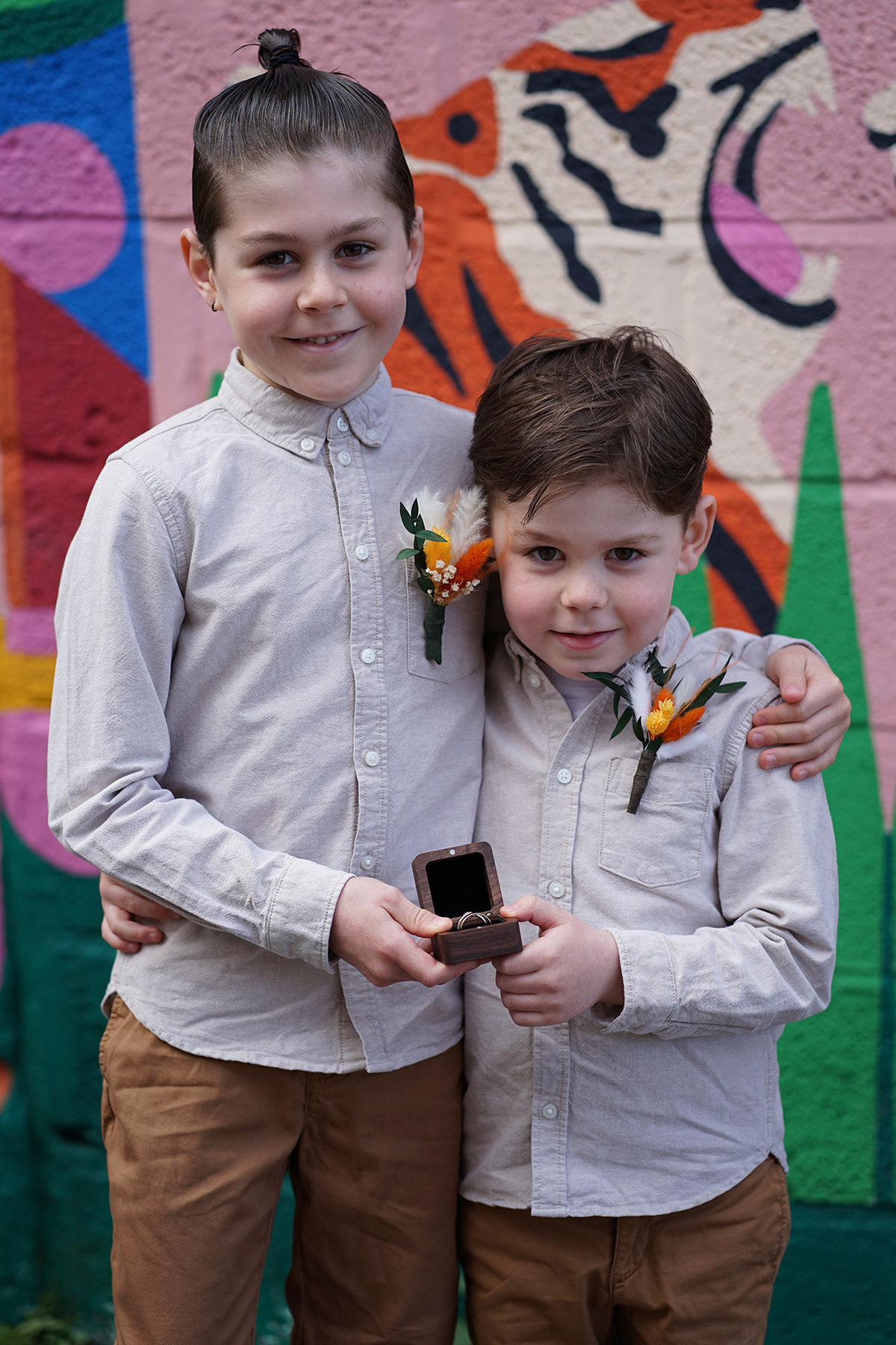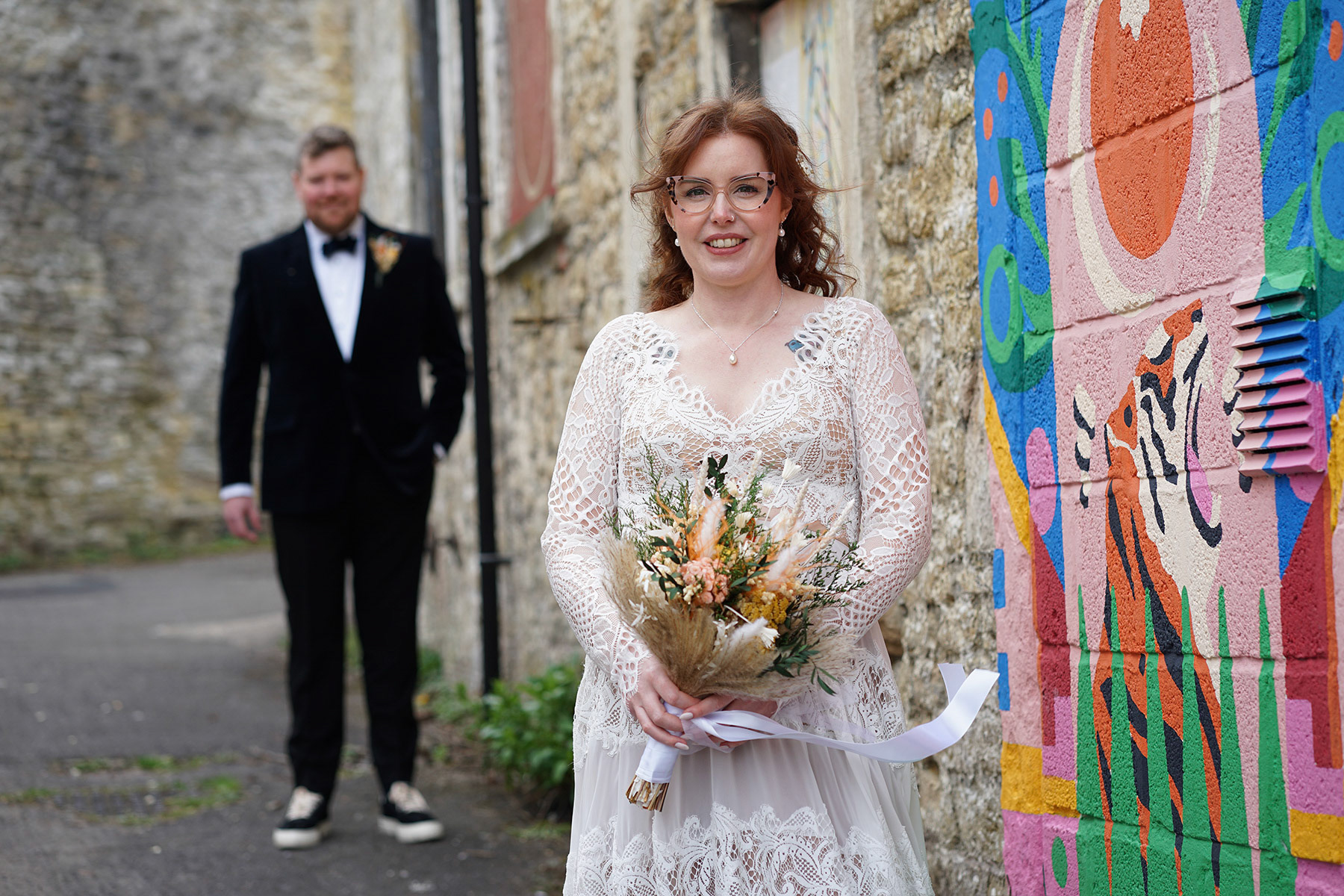 I love the exposed brick walls, as well as stunning outdoor and indoor space for your guests. An amazing mixture of industrial buildings and beautiful colour for the art and tiger mural make for memorable backdrops.